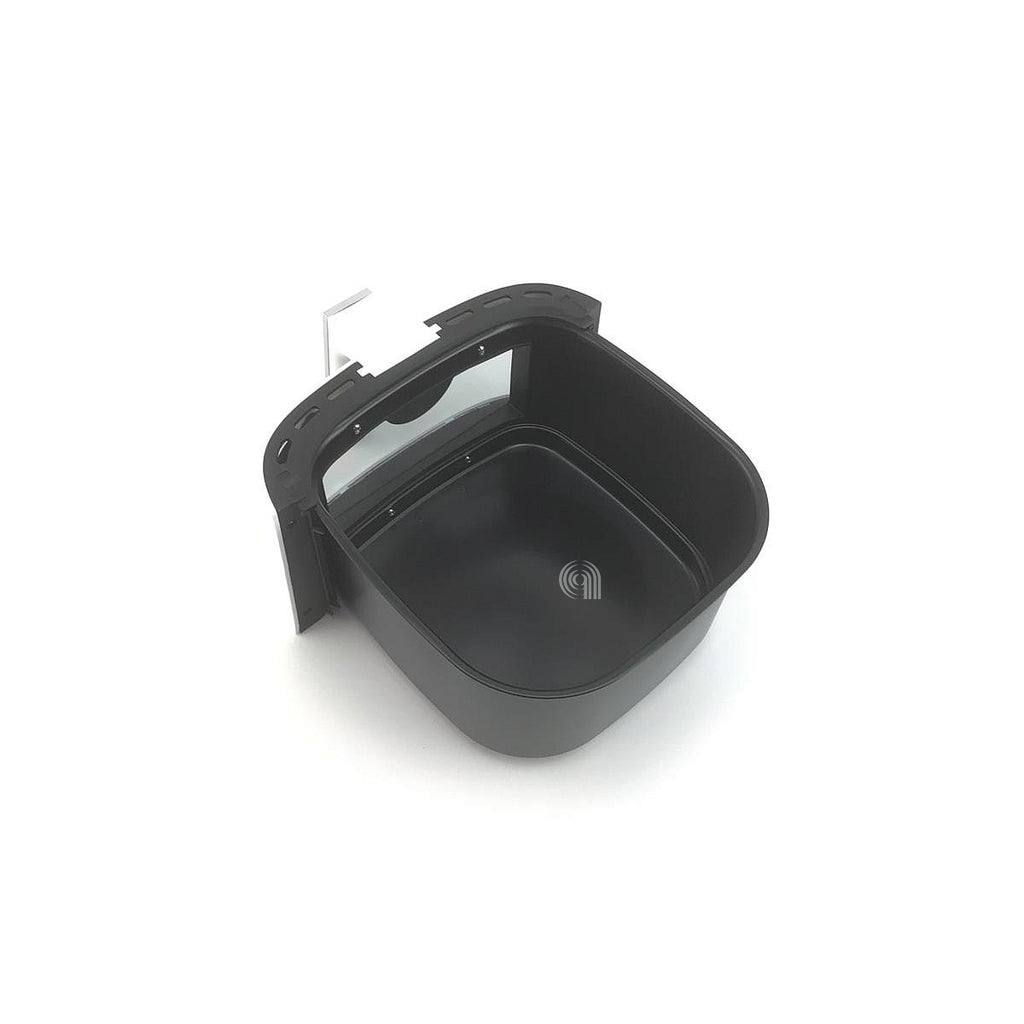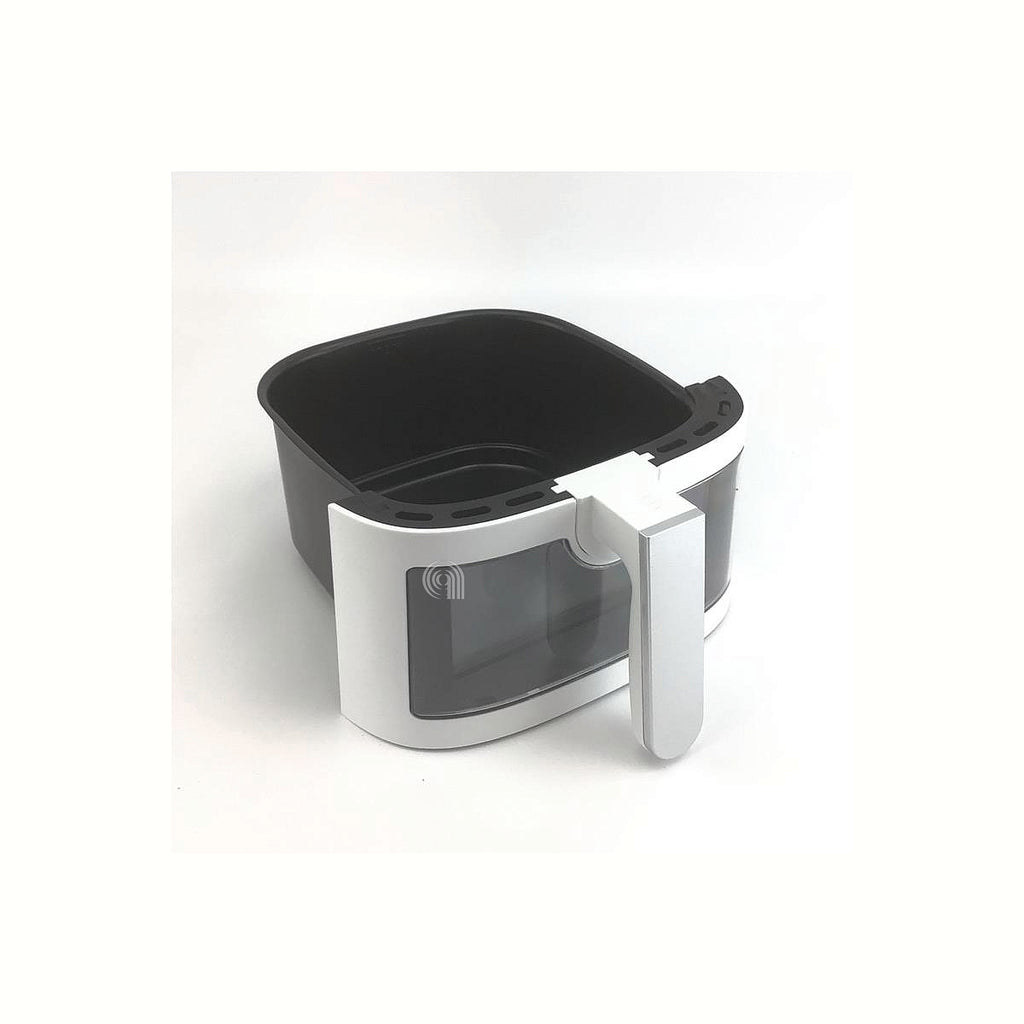 Este contenedor extraíble transparente y blanco es un repuesto original diseñado para freidoras DeLonghi, ideal para reemplazar el depósito donde se coloca el aceite y los alimentos durante la fritura.