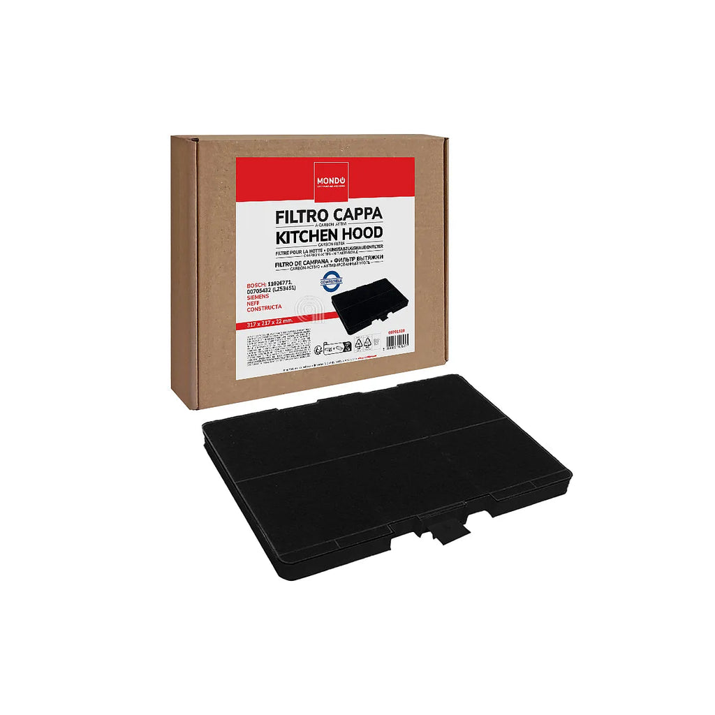 Filtro de carbón rectangular adaptable compatible con BOSCH, SIEMENS, CONSTRUCTA, NEFF, JUNKER, MONDO para campanas extractoras. Este filtro de alta calidad es una alternativa a las referencias originales, diseñado para eliminar eficazmente los olores y la grasa, manteniendo el aire de su cocina limpio y fresco. Ideal para modelos de campanas extractoras de marcas como Bosch, Siemens, Neff, Constructa, Junker y Mondo. Asegura un rendimiento óptimo y una fácil instalación. Prolonga la vida útil de su campana y mejora la calidad del aire en su hogar.