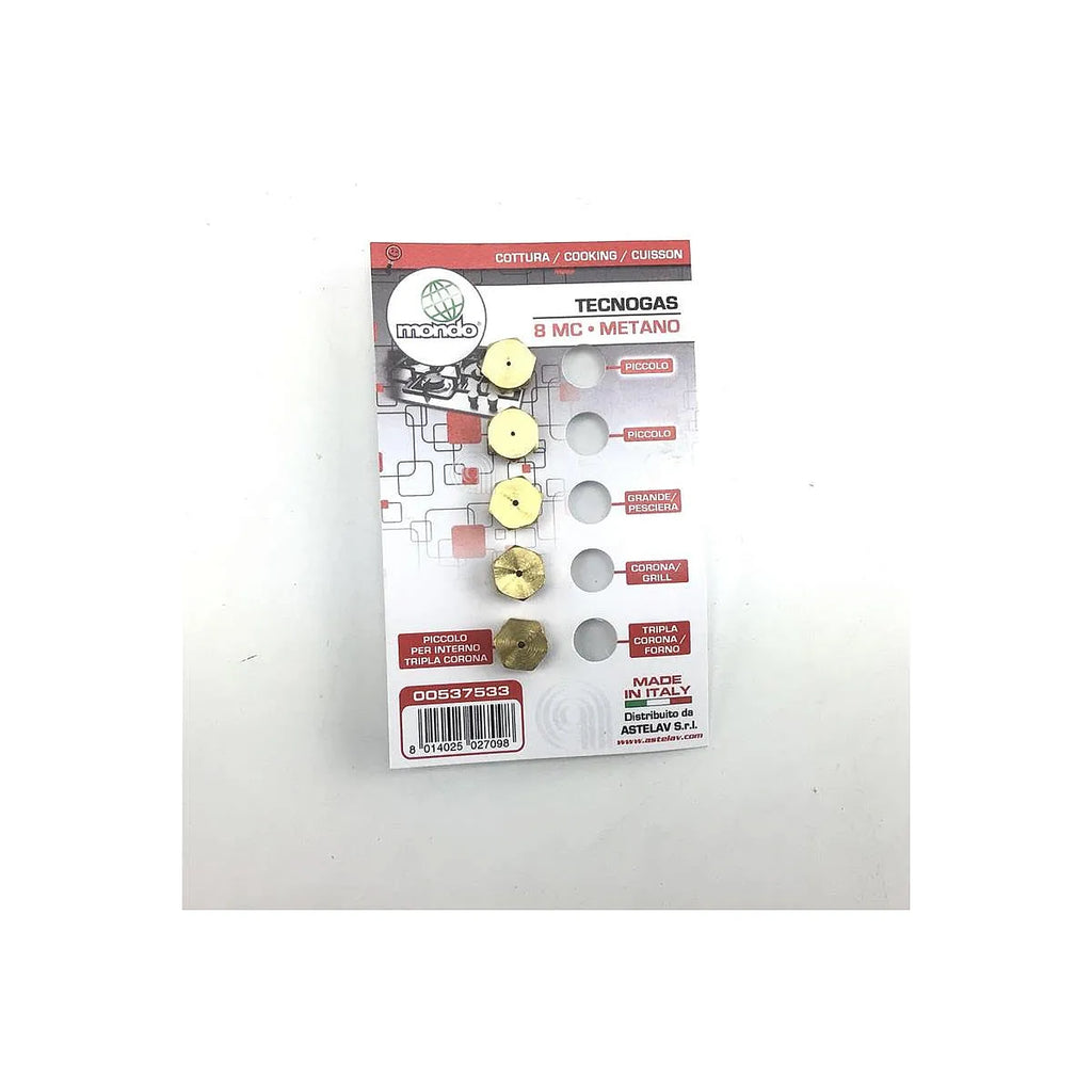 Kit de 5 boquillas de gas metano 8MC compatible con electrodomésticos de marcas como TECNOGAS, UNIVERSALE, MONDO. Este conjunto adaptable es ideal para la conversión o el reemplazo de inyectores en encimeras, asegurando un rendimiento óptimo y una combustión eficiente. Diseñado para ofrecer una solución versátil y duradera para su cocina. Las boquillas son un componente crucial para la correcta distribución del gas, garantizando la seguridad y la eficiencia energética de su aparato. Verifique la compatibilidad con su modelo específico antes de la compra.