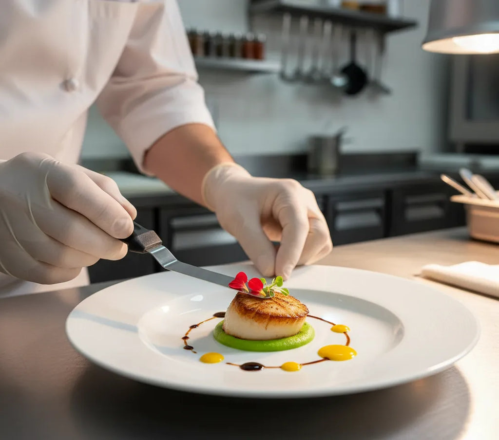 Es especialmente útil para trabajos de precisión que requieren control milimétrico: colocar microgreens sin aplastarlos, aplicar puntos exactos de salsa, decorar postres con flores comestibles, manipular caviar o huevas, añadir láminas de trufa, crear diseños con oro comestible, decorar canapés, y cualquier acabado final que marque la diferencia en la presentación. Es la herramienta que transforma un plato bien cocinado en una obra de arte culinaria.