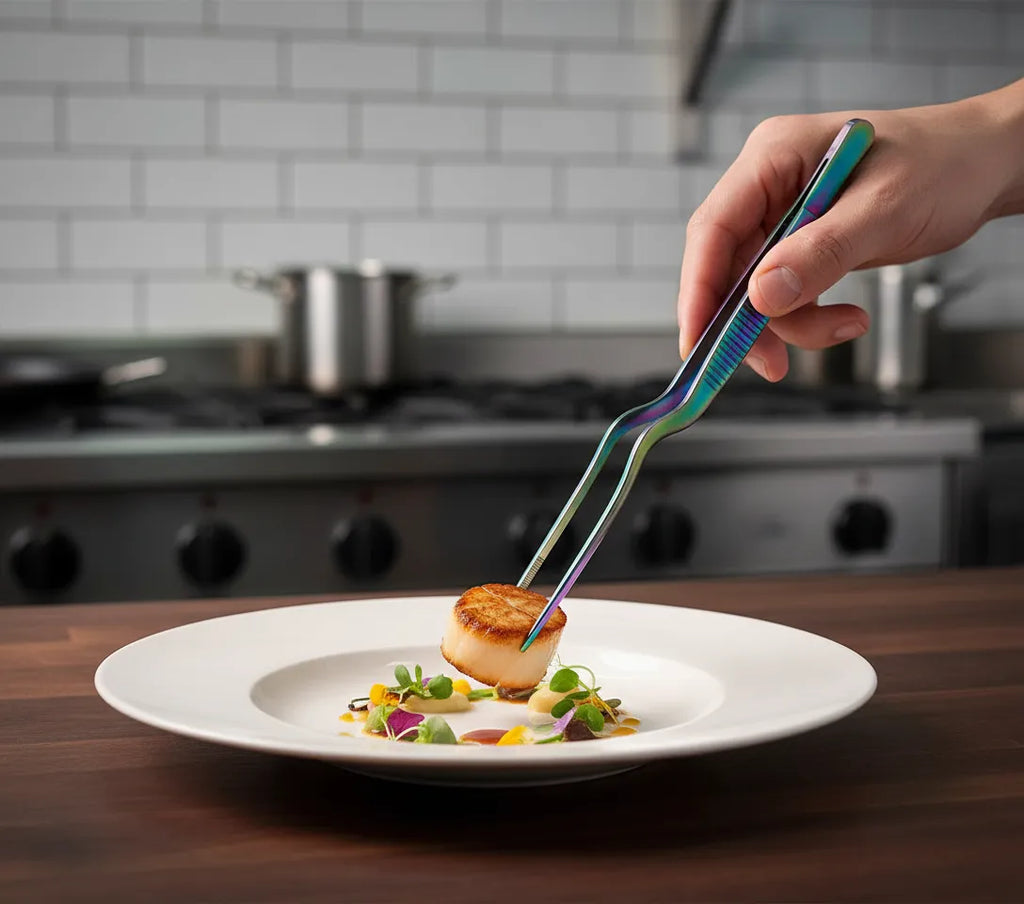 La pinza de precisión TITAN RAINBOW LACOR combina funcionalidad profesional con un espectacular acabado de titanio arcoíris. Fabricada en acero inoxidable 18/10 de máxima calidad, es la herramienta perfecta tanto para chefs profesionales como para cocineros caseros que buscan estilo y rendimiento.