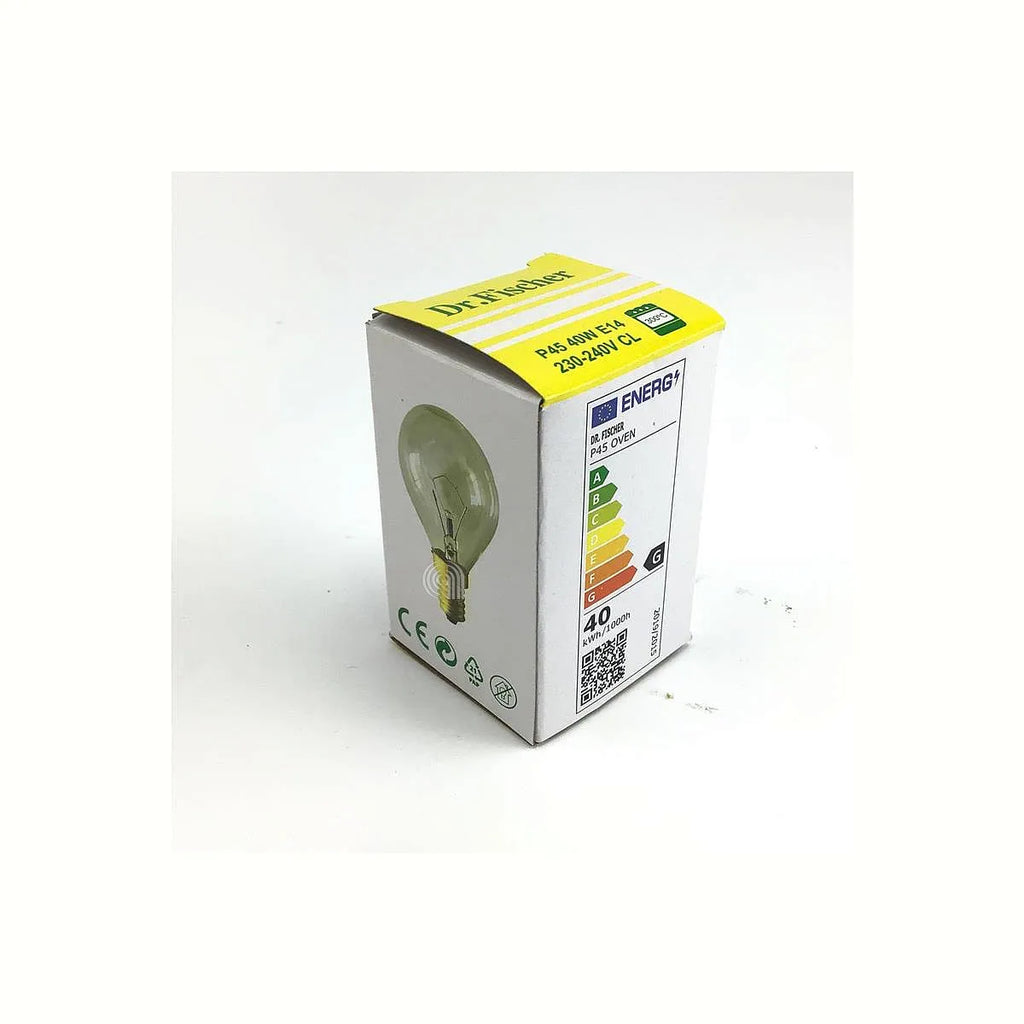 Lámpara de horno DR. FISCHER adaptable E14 40W 230V 300°C (45x78mm) compatible con ELECTROLUX, AEG, BAUKNECHT, BOSCH, BALAY, SIEMENS, CONSTRUCTA, NEFF, PITSOS, GAGGENAU, UNIVERSALE, JUNKER, HUSQVARNA, ELEKTRO HELIOS, ROSENLEW, PROFILO, JUNO, VOSS, UFESA, PARKINSON COWAN, KOENIC, ZELMER. Ideal para reemplazar la bombilla de su horno. Esta lámpara ofrece una iluminación óptima y duradera, asegurando la visibilidad necesaria para supervisar sus cocciones. Su diseño robusto está preparado para soportar las altas temperaturas del interior del horno, garantizando un rendimiento fiable y seguro. Asegúrese de verificar la compatibilidad con su modelo de horno antes de la compra. Referencias cruzadas: BOSCH: 00057874, ELECTROLUX: 50279890003.