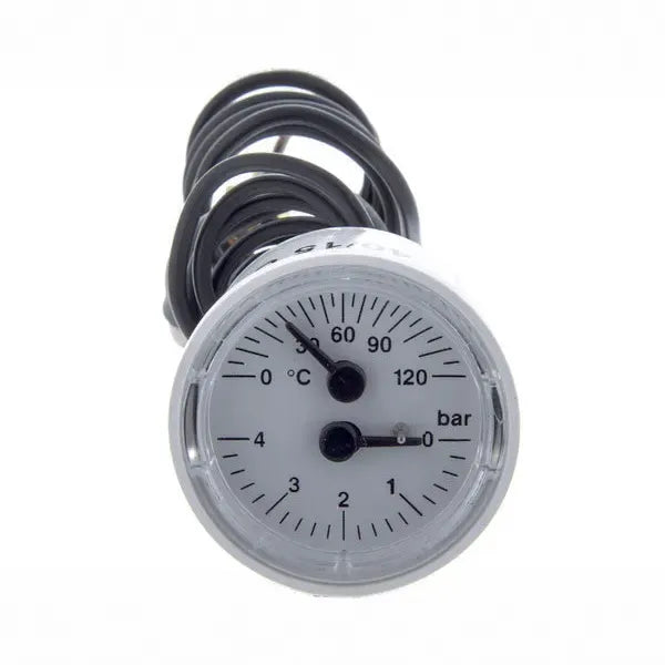 Este termomanómetro es un recambio esencial para calderas, utilizado para medir la presión y la temperatura del agua en el circuito de calefacción. Permite al usuario y al técnico monitorizar que la caldera funciona dentro de los parámetros seguros y adecuados, evitando daños por sobrepresión o sobrecalentamiento. Su funcionamiento combina un manómetro y un termómetro en una sola unidad, facilitando una lectura rápida y precisa.