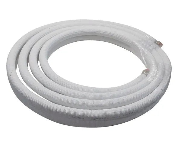 Tubo de cobre con aislamiento doble, con medidas de 1/4" y 3/8" y una longitud de 5 metros. Este producto está diseñado para instalaciones de aire acondicionado y sistemas de climatización, garantizando una alta durabilidad y resistencia a la corrosión gracias a su fabricación en cobre de alta pureza.