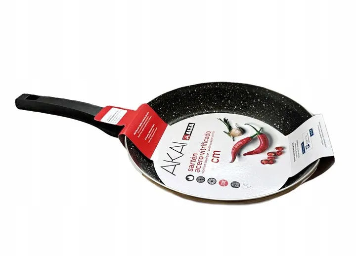 La sartén AKAI de 26 cm ofrece una amplia superficie de cocción, perfecta para preparar platos que requieren espacio. Fabricada en acero esmaltado, es robusta y duradera. El esmalte en su superficie facilita la limpieza y previene la oxidación. Compatible con todas las cocinas, incluyendo inducción.