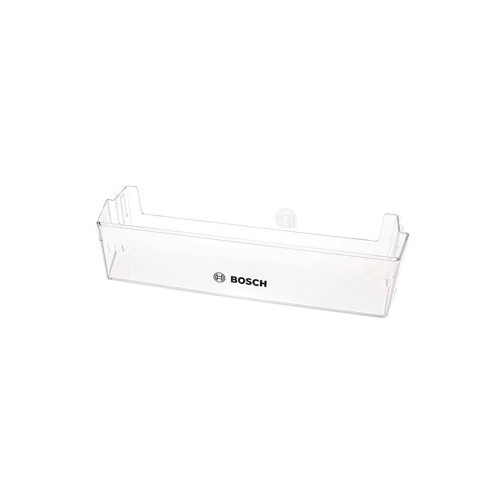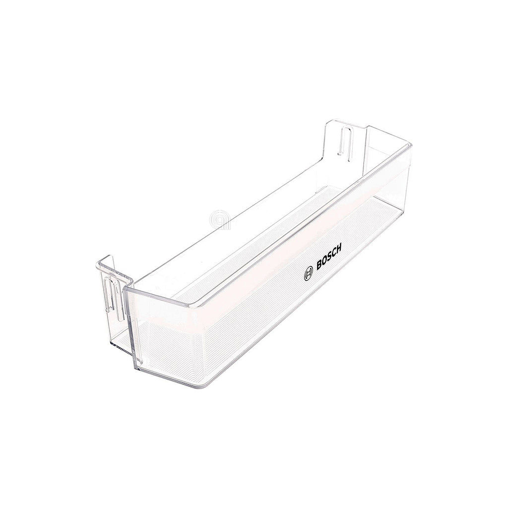 El balconcino es un soporte o estante para la puerta del frigorífico, diseñado para almacenar botellas, tarros u otros recipientes pequeños de forma segura y ordenada. Este modelo es un repuesto original Bosch, específico para frigoríficos, que garantiza la correcta fijación y funcionalidad dentro de la puerta del electrodoméstico.