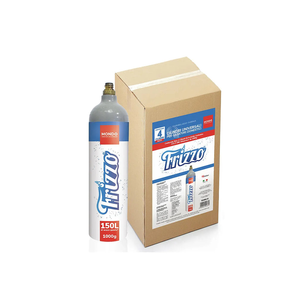 Caja de 4 cilindros de CO2 de 1kg, nuevos y universales, compatibles con dispensadores de agua de las marcas FRIZZO, MONDO. Estos cilindros de dióxido de carbono E290 de grado alimenticio son ideales para gasificadores domésticos, asegurando agua con gas fresca y deliciosa en todo momento. Su diseño adaptable permite una fácil instalación y reemplazo en una amplia gama de equipos. Disfrute de la comodidad y la calidad con estos recambios esenciales para su hogar.