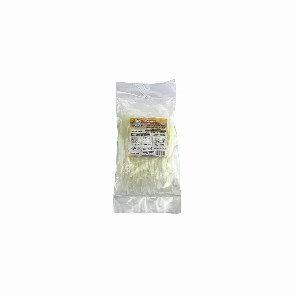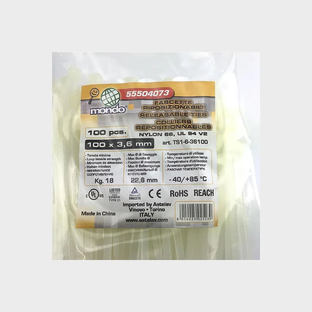 La fascetta reposicionable de nylon, compatible con las marcas UNIVERSALE y MONDO, es un componente adaptable diseñado para una amplia gama de aplicaciones. Fabricada en nylon 6.6 de color natural, esta fascetta ofrece una excelente resistencia y durabilidad. Soporta temperaturas de uso desde -40°C hasta +85°C y tiene una tenuta mínima de 18 kg. Su diseño permite un diámetro máximo de fijación de 22,6 mm, con unas medidas de 100x3,6 mm. Cuenta con aprobaciones de calidad como UL, TUV, CE y RoHS REACH, garantizando su fiabilidad y seguridad para diversos usos en accesorios y otros dispositivos.