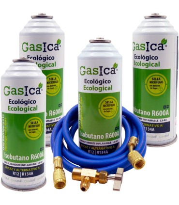 El gas refrigerante GASICA D2 (R600A) es una solución profesional diseñada como alternativa eficiente a los refrigerantes R12 y R134a. Este pack completo de 4 botellas incluye manguera de carga SAE 1/4"x1/4" y válvula de servicio, ofreciendo todo lo necesario para trabajos de refrigeración y climatización.