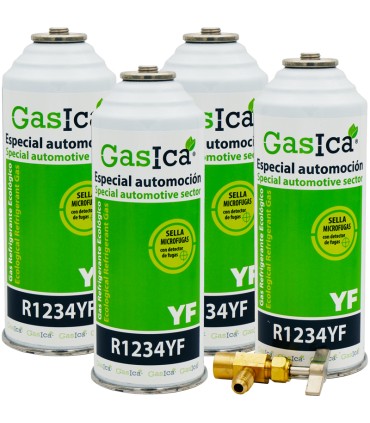 Pack ahorro de 4 botellas de recarga de gas refrigerante ecológico GASICA YF para aire acondicionado de automóviles. Gas refrigerante para automoción y en especial para carga de aire acondicionado de coche.