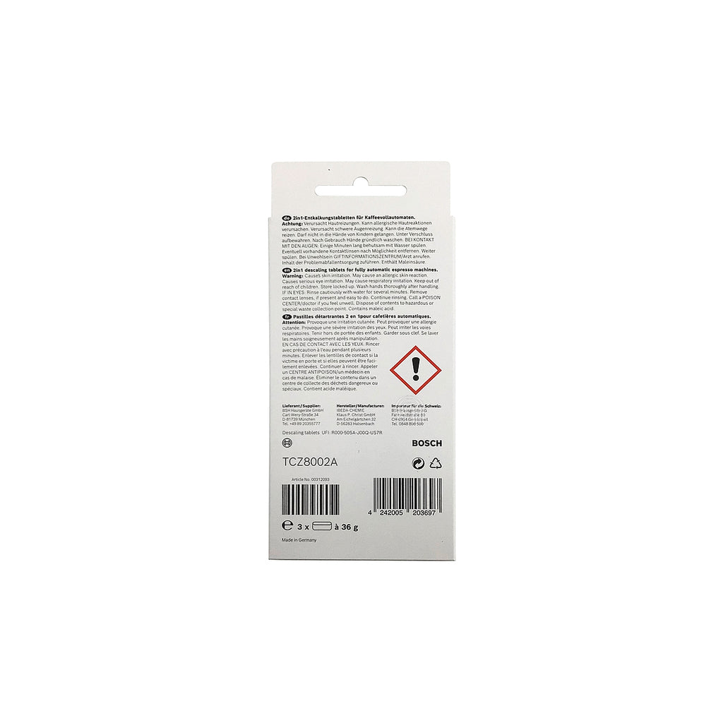 Estas pastillas descalcificadoras son compatibles con varias cafeteras Bosch, incluyendo modelos que utilizan los códigos de referencia 00312093, 00576694 y TCZ8002A. Se recomienda utilizar este recambio para mantener el rendimiento óptimo y prolongar la vida útil de la máquina.