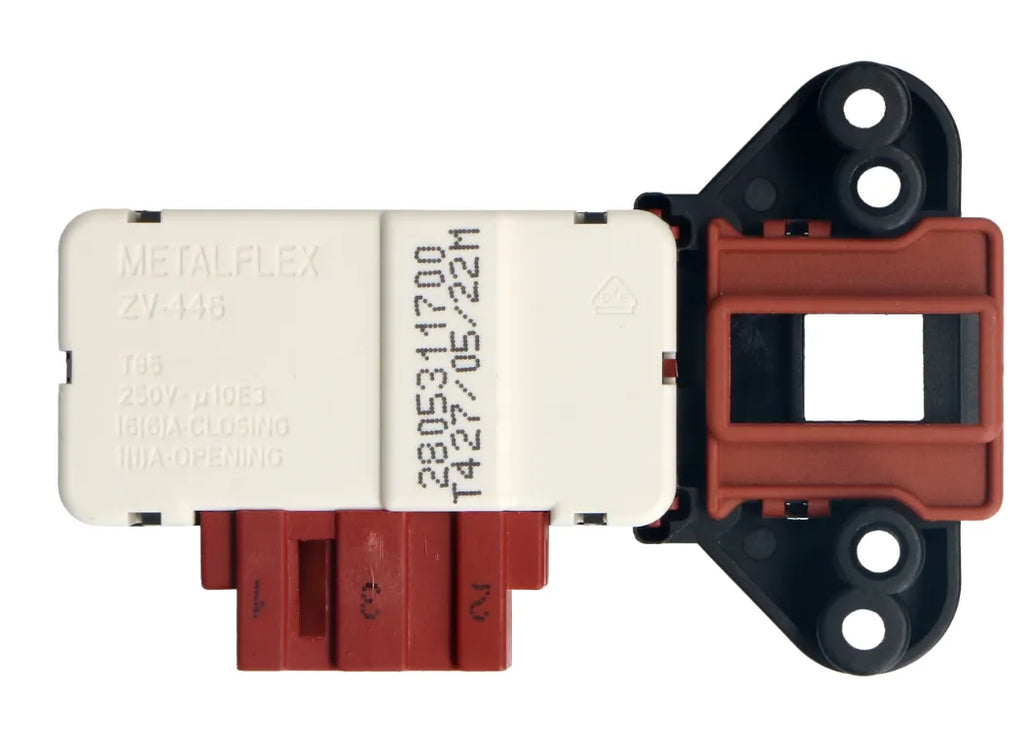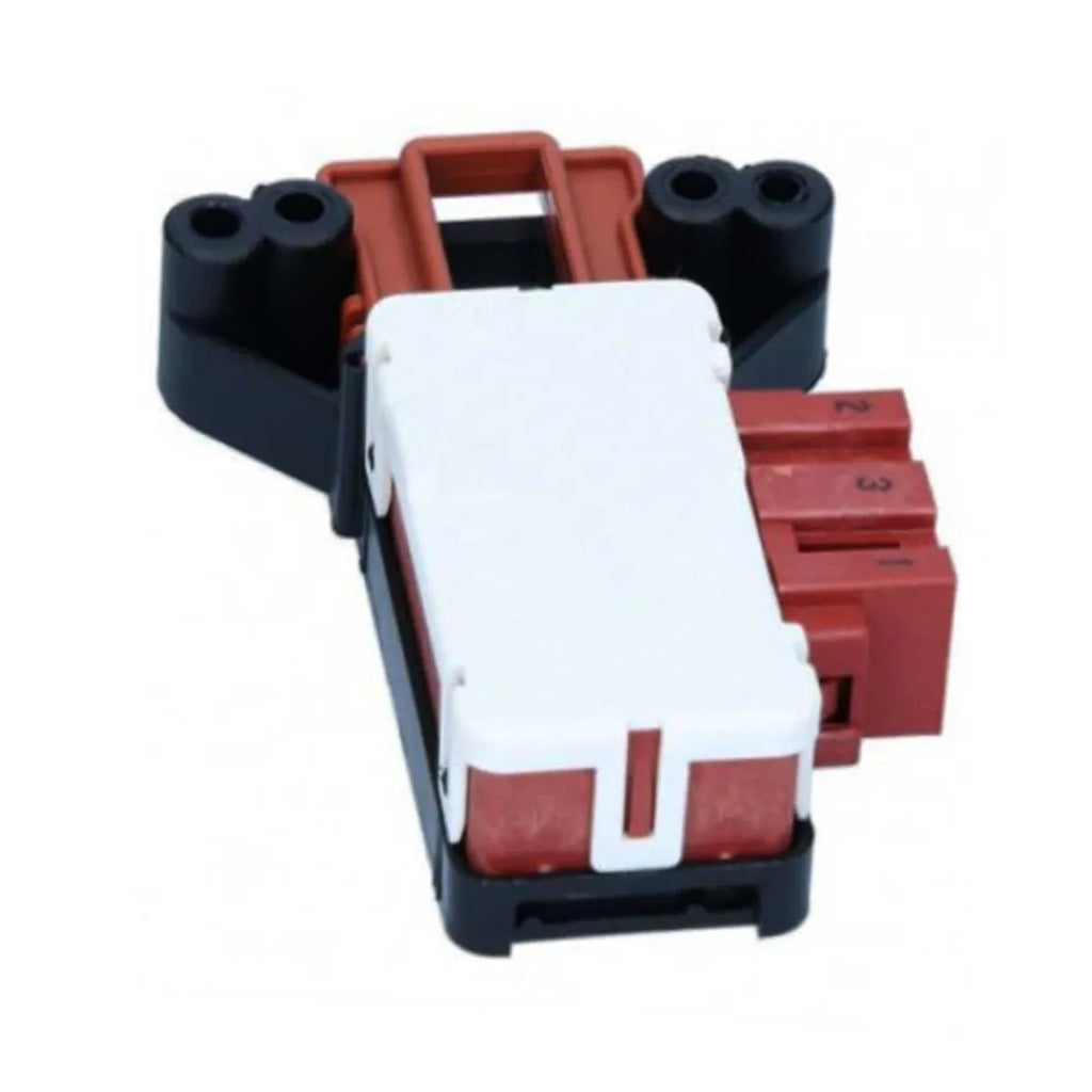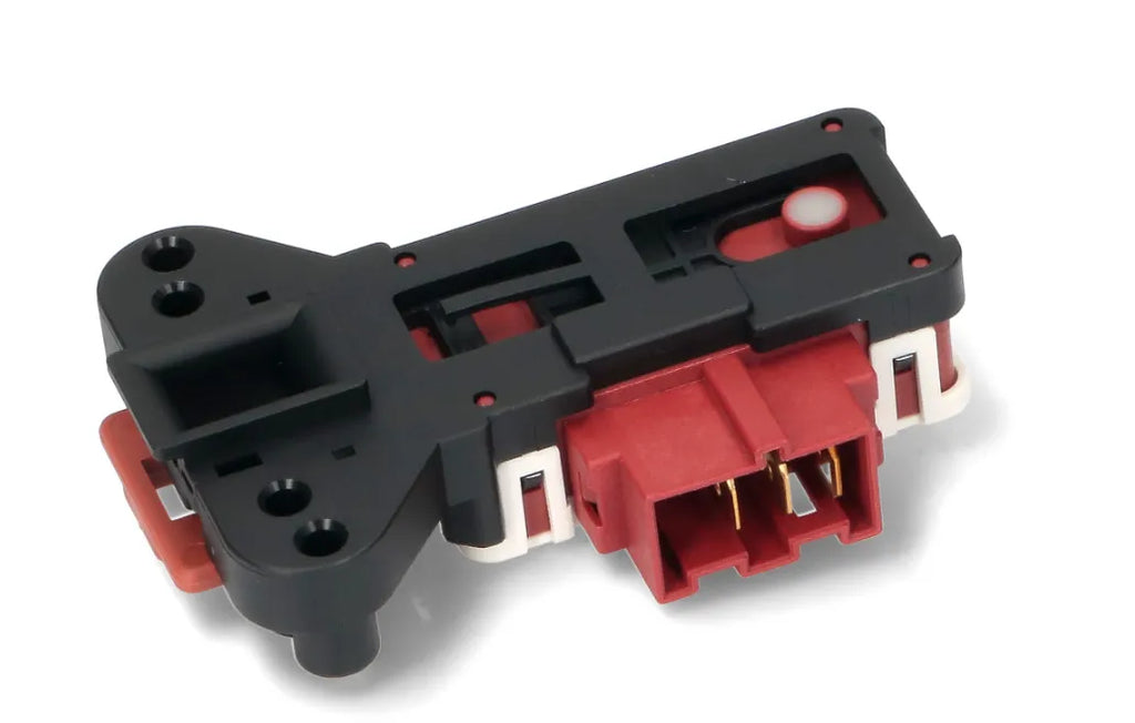 Retardador para cierre de puerta de electrodoméstico de lavado. Esta pieza también hace de interruptor, evitando que el aparato se ponga en marcha cuando la puerta está abierta. En ocasiones, cuando la lavadora no funciona, es porque este recambio está mandando una señal equivocada al módulo del electrodoméstico.
