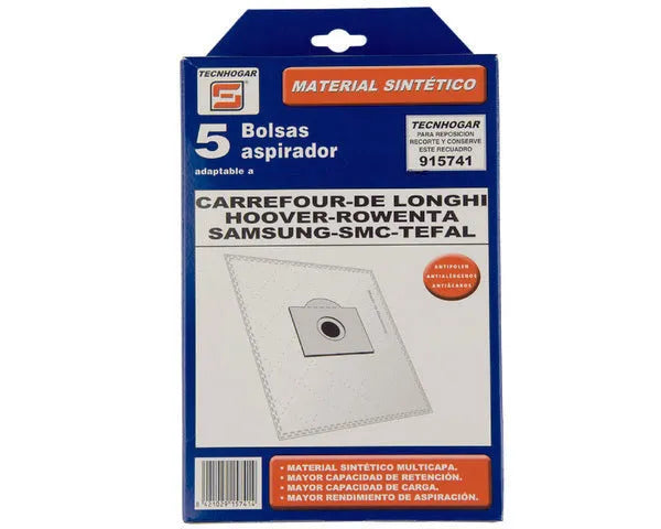 Saco aspirador sintético. Multimarca. 5 unidades. C.O. 915741. CARREFOUR, DELONGHI, HOOVER, SMC, SAMSUNG, TEFAL.