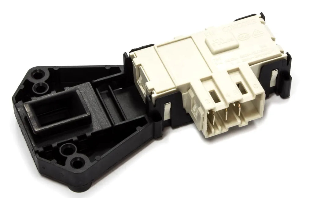 Cierre eléctrico de puerta lavadora Samsung de recambio. Accesorios para reparación de lavadoras. Esta pieza tiene dos funciones: bloquea la apertura de la lavadora durante el funcionamiento y hace de interruptor general del electrodoméstico, es decir, la lavadora no puede funcionar mientras la puerta permanece abierta. El blocapuertas es una de las piezas esenciales en el funcionamiento de la lavadora.