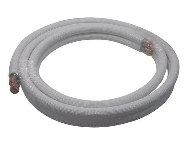 Este tubo de cobre aislado doble está diseñado para instalaciones de aire acondicionado y refrigeración. Con diámetros de 1/4'' y 3/8'', y una pared de 0,80 mm, ofrece una solución robusta y eficiente para la conducción de gases refrigerantes.